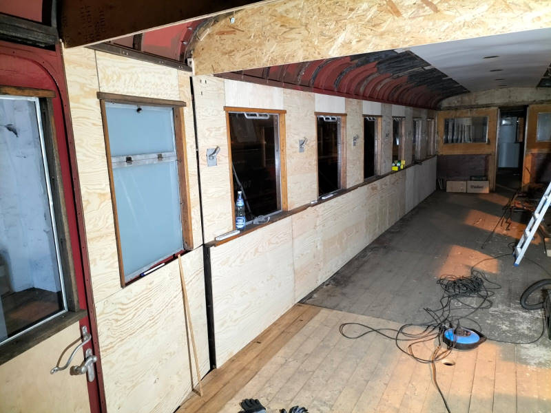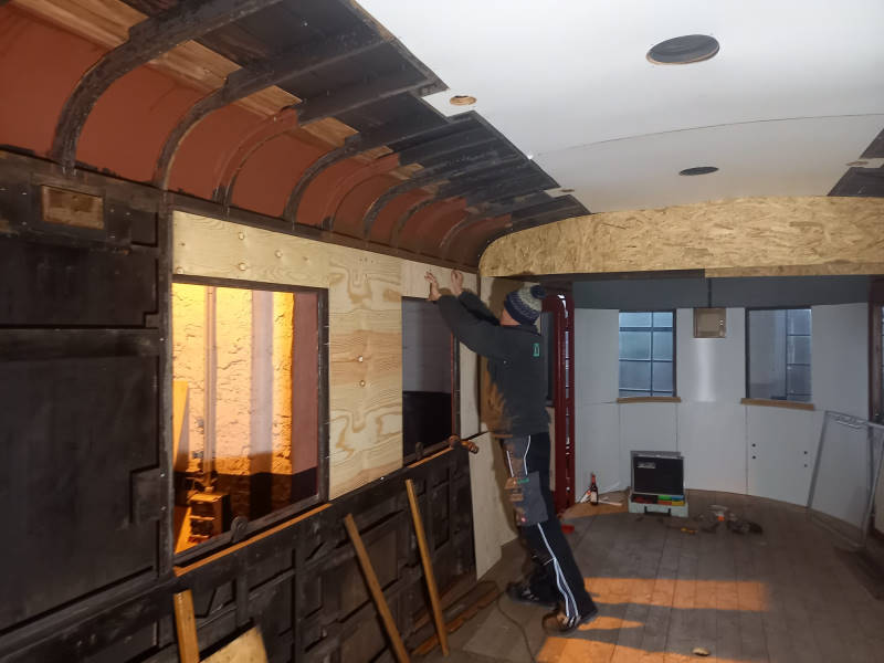 Wie bereits oben erwähnt, wird auch am Beiwagen 197 805 gearbeitet. Hier geht der Innenausbau weiter voran. So wurden in den letzten Tagen die neuen Wandverkleidungen aus Holz eingebaut.