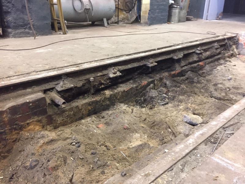Wie bereits im Dezember angekündigt, beschäftigen sich einige Aktive nun mit dem Gleisbau bei unserem Lokschuppengleis 1. Nach Entfernen der Deckplatten zwischen den Schienen wurde die darunter liegende Wartungsgrube teilweise freigelegt, um den Zustand der Grubenwand und der Schwellen unter den Schienen begutachten zu können. Leider stellte sich dabei heraus, dass die Schwellen an einigen Stellen stark verrottet sind.